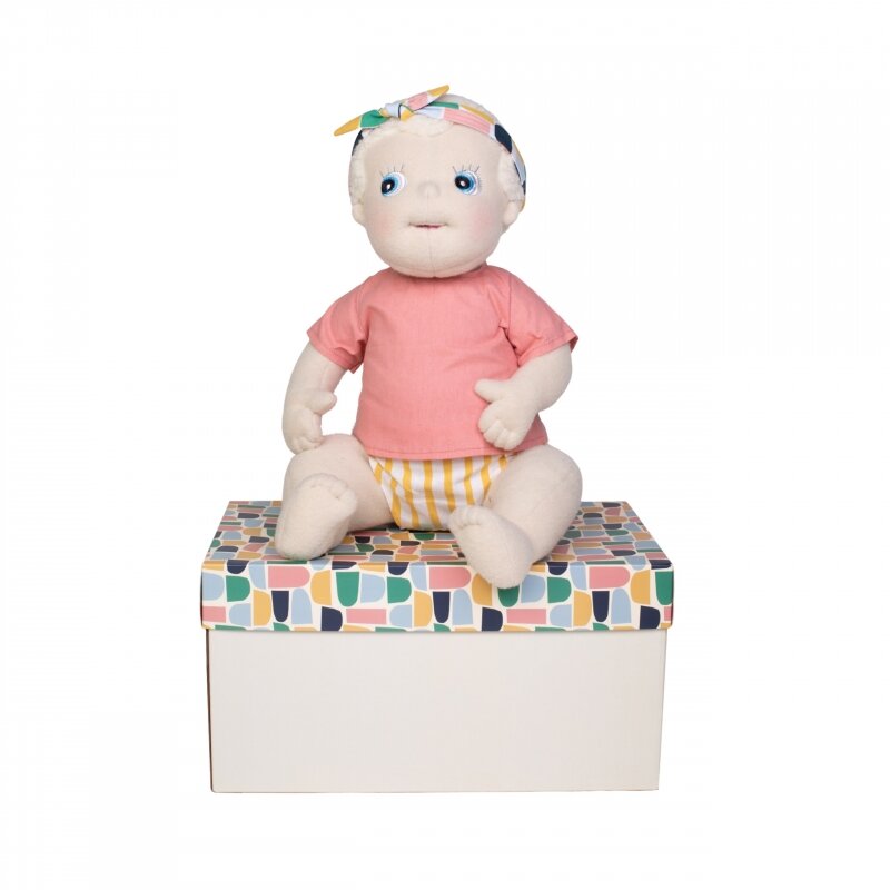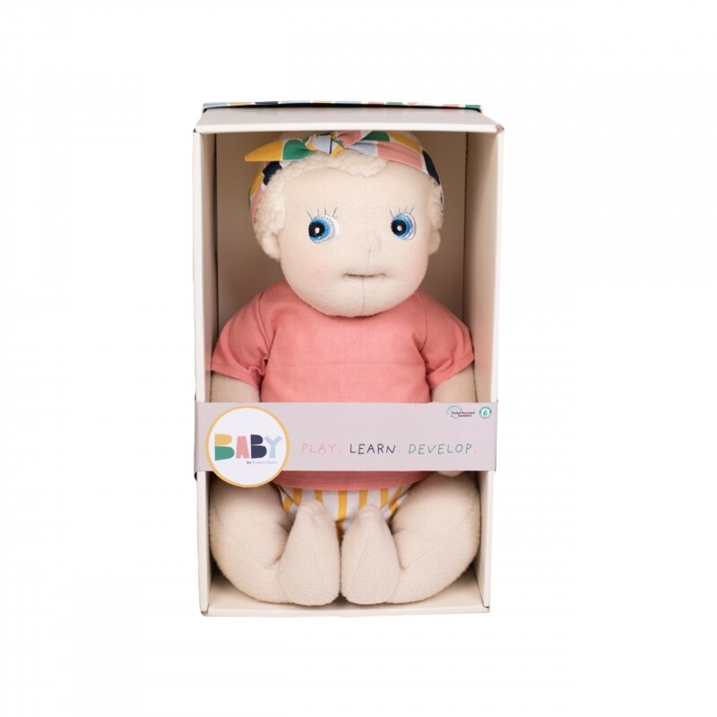 Rubens Baby, Esmé, zit vol met babbels en heeft veel te vertellen. Haar woorden komen soms een beetje hobbelig uit, maar als ze de tijd krijgen, kunnen ze je precies vertellen wat ze bedoelt (Esmé heeft een ontwikkelingsgestotter). Babypop Esmé is een emotioneel intelligente vriend die helpt bij taalontwikkeling, spelvaardigheden en lichaamsbewustzijn. Deze zachte handgemaakte pop is speciaal ontwikkeld in samenwerking met experts om kinderen spelenderwijs te helpen hun lichaam, emoties en de wereld om hen heen te leren kennen. Rubens Baby Esmé heeft een lichte huid en blond haar. De pop heeft een zacht lichaam en is 45 cm lang en weegt 600 gram. De huid van de pop is gemaakt van 100% biologisch katoen, gecertificeerd door Organic Content Standard (OCS) en heeft 100% Global Recycled Standard (GRS) polyestervezelvulling.