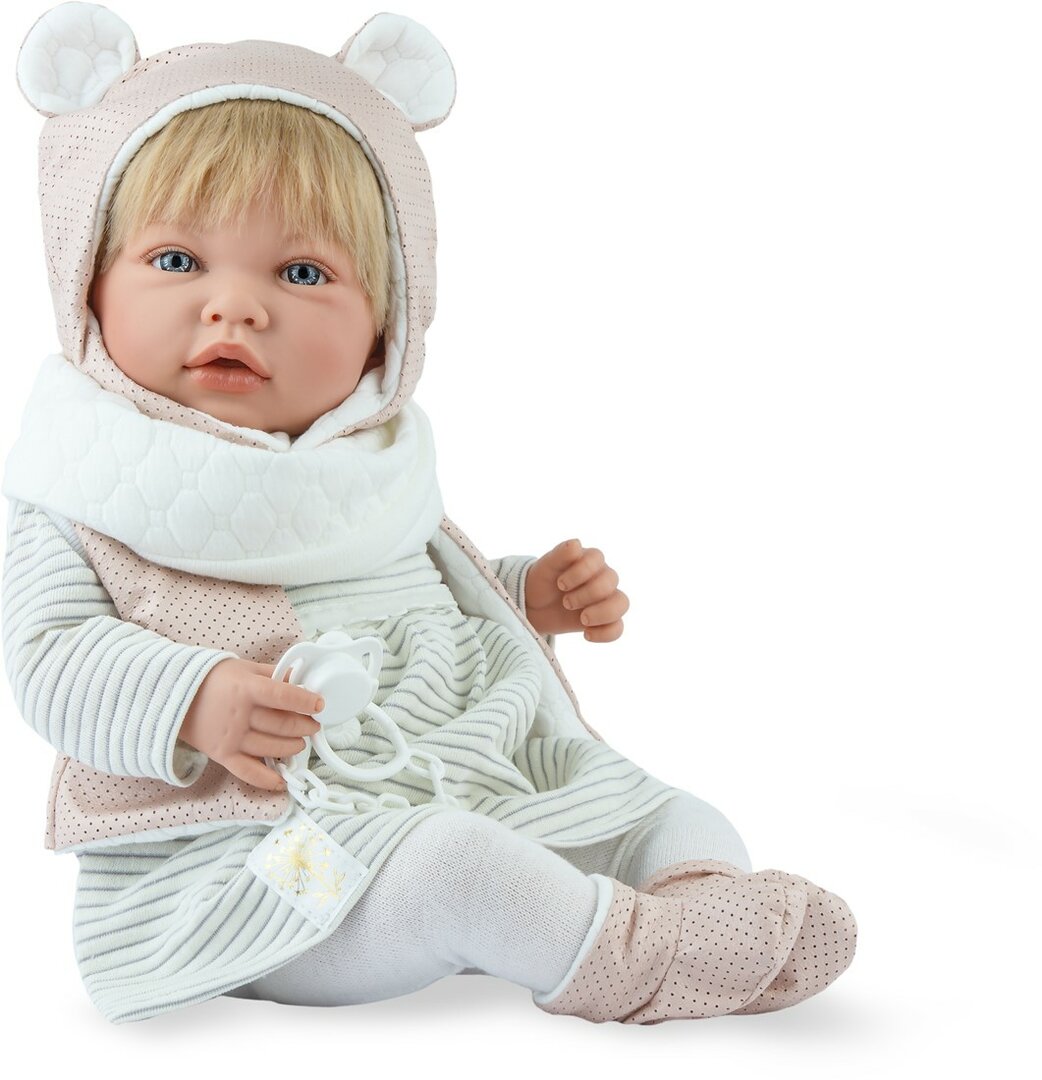 Ontdek Babypop Elise (45 cm) – een lieve, realistische babypop met blond haar, stralende blauwe ogen en een speen aan een speenketting voor extra speelplezier en veiligheid. Deze zachte pop is perfect voor kinderen die graag knuffelen, verzorgen en rollenspellen spelen.