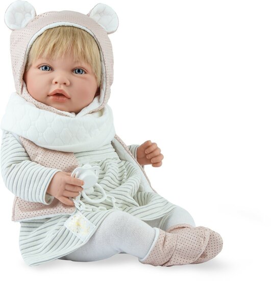 Elise draagt een witte malloit, een stijlvol grijs-wit gestreept jurkje en een schattige roze, gestippelde bodywarmer met muts met berenoren en een bijpassende sjaal. Haar beweegbare ledematen en zachte lijfje maken haar heerlijk om mee te spelen en te knuffelen.