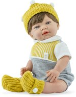 Finn is gekleed in een stijlvol, zomers setje: een grijs-geel rompertje met korte mouwen, blote beentjes, gele gebreide sokjes en een bijpassend geel gebreid mutsje. Geen drukke prints, maar een rustige en moderne look die perfect past bij de tijdloze stijl van Marina & Pau. De kleurencombinatie straalt zachtheid en vrolijkheid uit, precies wat je zoekt in een pop voor jonge kinderen.