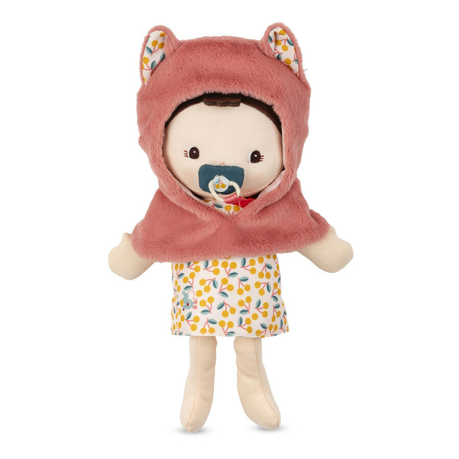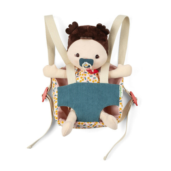 Met haar 2 afneembare accessoires is de Jeanne-pop klaar voor avontuur! Haar speen zit vast aan haar jurkje met print, zodat ze hem nooit kwijtraakt. Het is magnetisch, zodat het op het gezicht van de pop blijft zitten en er niet afvalt als je hem uitdoet. Voor extra comfort draagt Jeanne haar warme stoffen cape in de vorm van een kat. Dankzij de bandjes is de draagzak eenvoudig te verstellen, zodat deze perfect past bij jouw kleintje. Het enige wat je hoeft te doen is baby Jeanne in de draagzak te zetten, tegen jouw kindje aan, en jullie kunnen gaan genieten van een frisse neus of een activiteit terwijl iedereen de handen vrij heeft! Genoeg om de fantasie en het inlevingsvermogen van jouw peuter te stimuleren in goed gezelschap, en om alle beginnende ouders die graag op kinderen passen tevreden te stellen. Tijdens wandelingen beschrijven ze het landschap, letten ze erop dat hun baby het naar zijn zin heeft en zorgen ze voor hem als hij even rust nodig heeft.