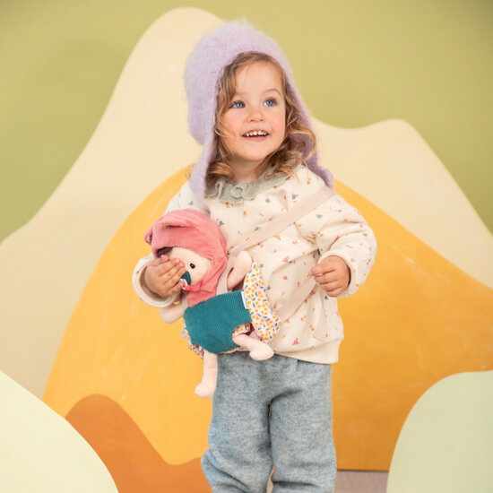 Klaar voor een wandeling in een draagzak met de Jeanne-pop? Met deze stoffen pop en de bijbehorende accessoires heeft jouw kindje alles wat hij of zij nodig heeft om volwassenen na te doen en met zijn of haar baby in de buurt te gaan wandelen. Dit kan al vanaf 18 maanden.