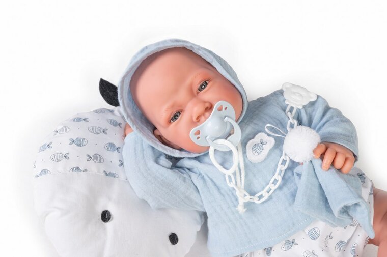om de kleintjes te vergezellen om de wereld te ontdekken. Deze pop is gemaakt met een zacht lichaam die je uitnodigt om te knuffelen en de tederheid in jou wakker maakt. Jeffrey is een heerlijke babypop van 42 cm groot. Hij is gemaakt van de beste kwaliteit vinyl en voelt heerlijk zacht aan. De pop heeft een prachtige, levensechte, gezichtsuitdrukking en draage een hoodie, luierbroekje, fopspeen aan een ketting. De pop wordt met een kussen in de vorm van een vis om heerlijk op te liggen of om samen op te spelen geleverd.