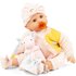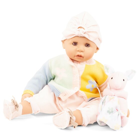 Cookie is in zomerstemming. Ze draagt ​​een fijn gestreepte jumpsuit met lange mouwen, comfortabele stoffen schoenen en een heel chique hoofddoek met knopen. Als het buiten koud wordt, komt het supermooie gebreide jasje met pastelkleurige bloemen mee. Als het knuffelkonijn bij haar is, is Cookies wereld prima. Als ze moe wordt, zuigt ze een beetje aan de speen en valt in slaap.