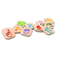 Op een spelende wijze kun je  met deze set de gebaren (volgens de American Sign Language) van de cijfers 1 tot en met 10 leren. Doordat het getal en het bijbehorende aantal stippen in reliëf in de stenen gemaakt zijn kan je de vorm met de vinger volgen en de stippen tellen. Ken jij het gebaar voor 8 al?