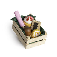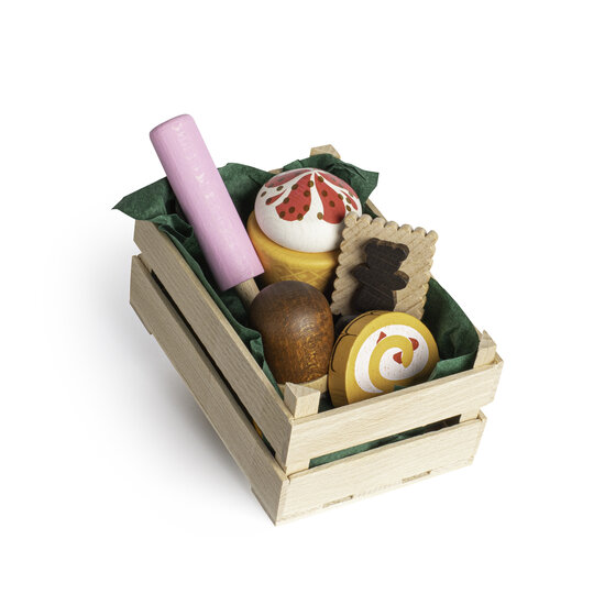 Gesorteerde houten lekkernijen in marktkrat klein (6 delig)