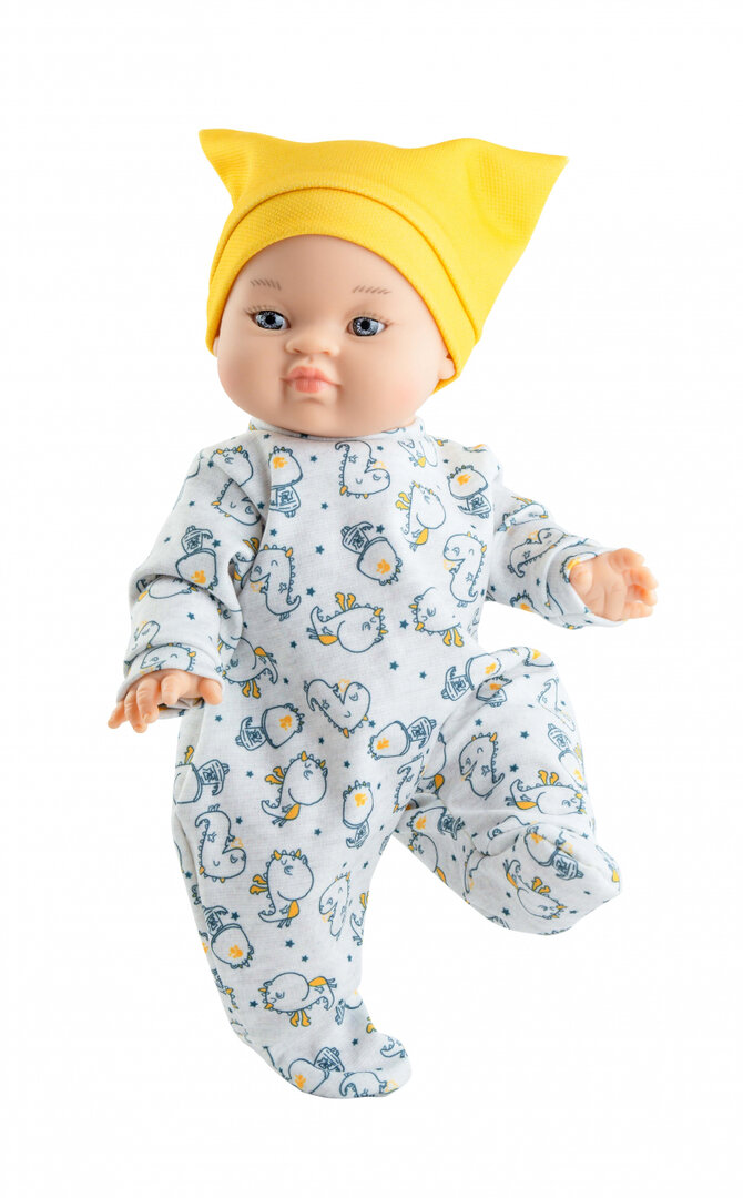 Kleding: babypakje (dinoprint), muts (geel)