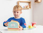 Een verend broodrooster met 2 sneetjes toast, een klodder boter met klittenband hierdoor kan het kind zelf een stukje boter er af snijden, een pot jam, een mes en een bord. Deze prachtige houten speelset behoort tot de Honeybakecollectie.
