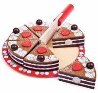 Een overheerlijke houten chocoladetaart "gebakken" door uw eigen chefkok. Door de klittebandverbindingen is deze taart ook het ideale hulpmiddel bij het leren snijden met een "echt" mes. Deze taart wordt compleet met bord en mes geleverd.