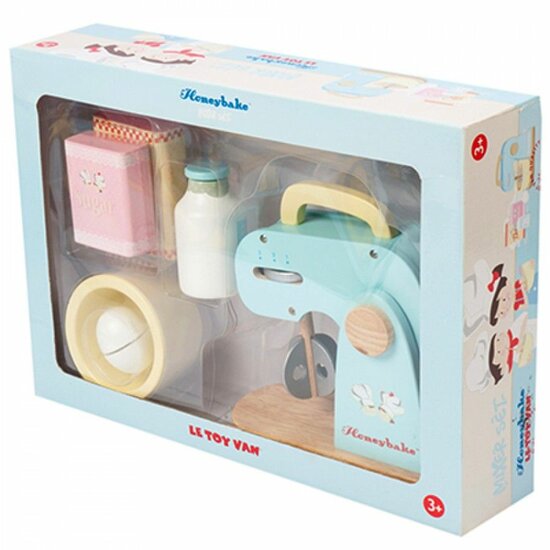 Een houten Honeybake-mixer speelset met afneembare beslagkom. De mixer heeft 3 standen waarin het de mestanddelen kan "mixen". Ingrediënten als twee halve eieren, melk, meel en suiker maken deze speelset compleet.