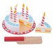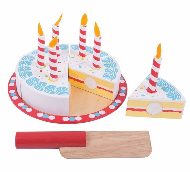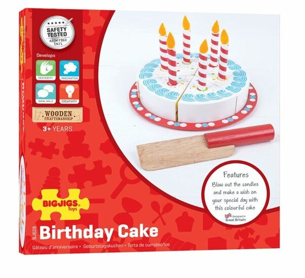 Blaas de kaarsjes uit en doe een wens op deze speciale dag! Een overheerlijke houten verjaardagstaart "gebakken" door uw eigen chefkok. Door de klittebandverbindingen is deze taart ook het ideale hulpmiddel bij het leren snijden met een "echt" mes. Deze taart wordt compleet met bord, kaarsjes en mes geleverd.