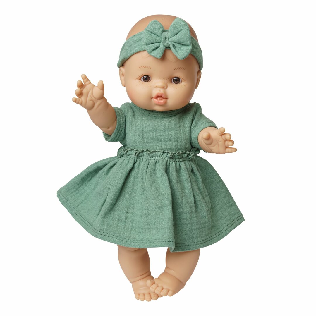 De zachte mousselinestof van gecontroleerde biologische teelt, met een lichte rimpeling in de taille, geeft jouw pop een prachtige silhouet. De bijbehorende haarband met strik is elastisch en past daardoor perfect op elk poppenhoofdje.