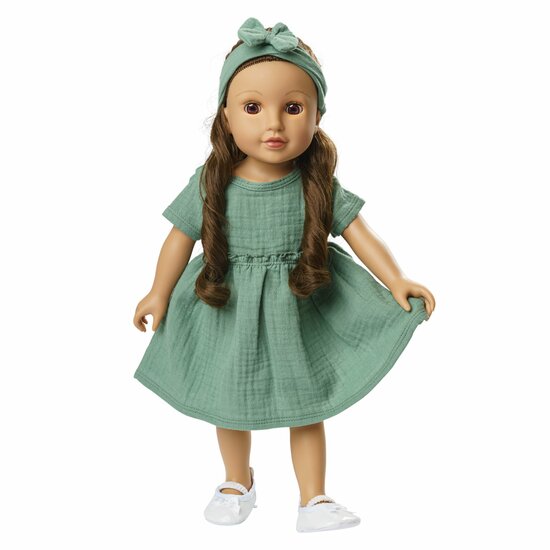 Dit schattige poppenjurkje van Heless, gemaakt van 100% biologisch katoen, biedt onbezorgd en eindeloos speelplezier met jouw pop. Het jurkje met ruches en bijpassende haarband in trendy saliegroen ziet er niet alleen absoluut betoverend uit, maar geeft je ook een compleet goed gevoel.
