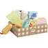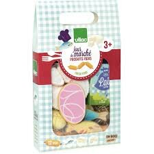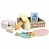 Mooie kartonnen krat met daarin twee vissen, een plakje ham, een touw met worstjes, een ei, een melkpak, een camembertkaas en een stuk comtékaas. Deze set is ideaal om winkeltje mee te spelen. Sommige onderdelen zijn van stof gemaakt.