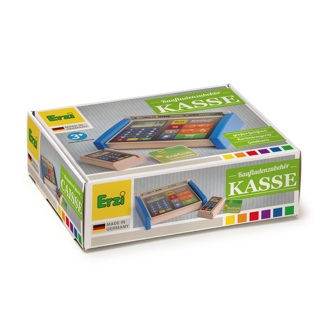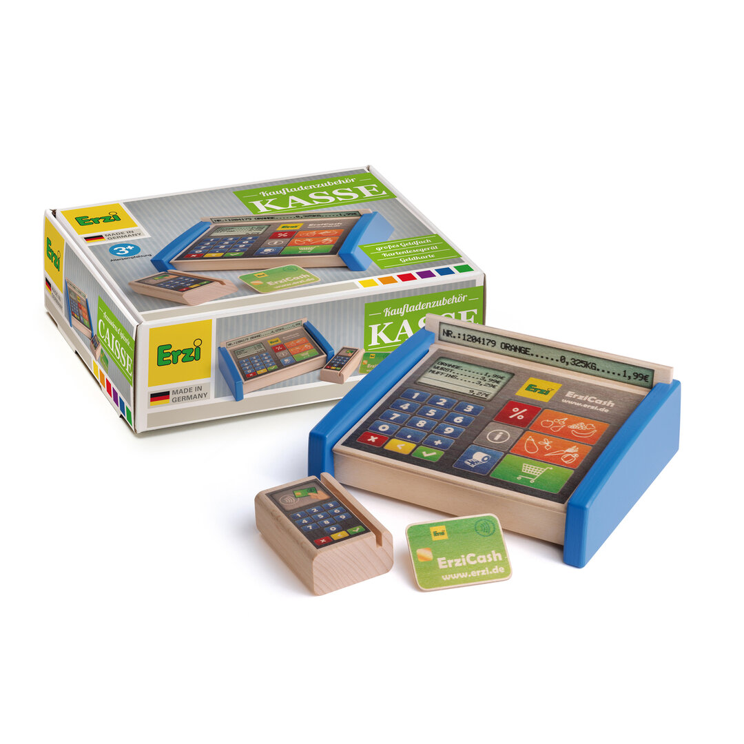 Onmisbaar voor iedere winkel: deze geheel beukenhouten kassa in vrolijke kleuren. De kassa heeft een groot "touchpad", display en een opbergvak voor het geld. Een eigen pinautomaat behoord ook tot de leveringsomvang. Hierbij mag de pinpas uiteraard niet ontbreken. Ideaal als aanvulling voor een speelwinkeltje.