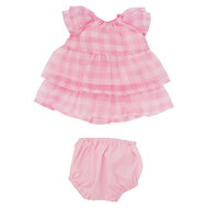 Heerlijk roze en klaar om te spelen. Deze tweedelige outfit heeft een gelaagde jurk van gingham-organza met fladdermouwen, een geplooide hals en gevoerd met roze katoen. De jurk heeft een sluiting aan de achterkant voor gemakkelijk aan- en uitkleden. De outfit wordt geleverd met bijpassende roze katoenen broekje met een elastische tailleband. Deze poppenkledingset past op alle 38 cm Baby Stella-poppen.