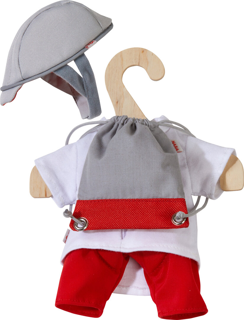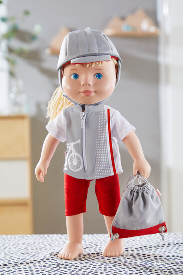 Ook Haba-poppen zijn dol op fietsen. Met de klerenset fietser kunnen poppenouders samen heerlijk fietsen! Alle Haba kleding is eenvoudig aan- en uittrekken dankzij de klittenbandsluiting. De set bestaat uit 1 fietsbroekje, 1 rugtas, 1 shirt en een fietshelm want veiligheid staat altijd voorop. De kleren zijn wasbaar bij 30 °C. De poppenkleren van Haba worden compleet met een leuke houten kleerhanger speciaal voor poppenkleren geleverd.
