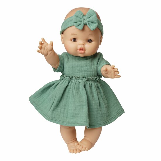 De zachte mousselinestof, afkomstig uit gecertificeerde biologische teelt, en de lichte plooien in de taille creëren een prachtige pasvorm voor je pop. De bijpassende haarband met strik is elastisch en zorgt voor een perfecte pasvorm op het hoofd van elke pop.