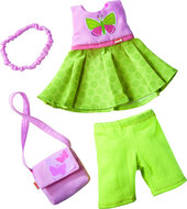 Met deze klerenset zijn de geliefde poppen elke dag weer netjes aangekleed. Bijzonder mooie accessoires zijn de praktische handtas en het snoezige haarlint.De kledingset is hoogwaardig afgewerkt en bestaat uit 1jurk, 1 legging, 1 handtas en een haarband. Alle Haba kleding is eenvoudig aan- en uittrekken dankzij de klittenbandsluiting. De kleren zijn wasbaar bij 30 °C. De poppenkleren van Haba worden compleet met een leuke houten kleerhanger speciaal voor poppenkleren geleverd.