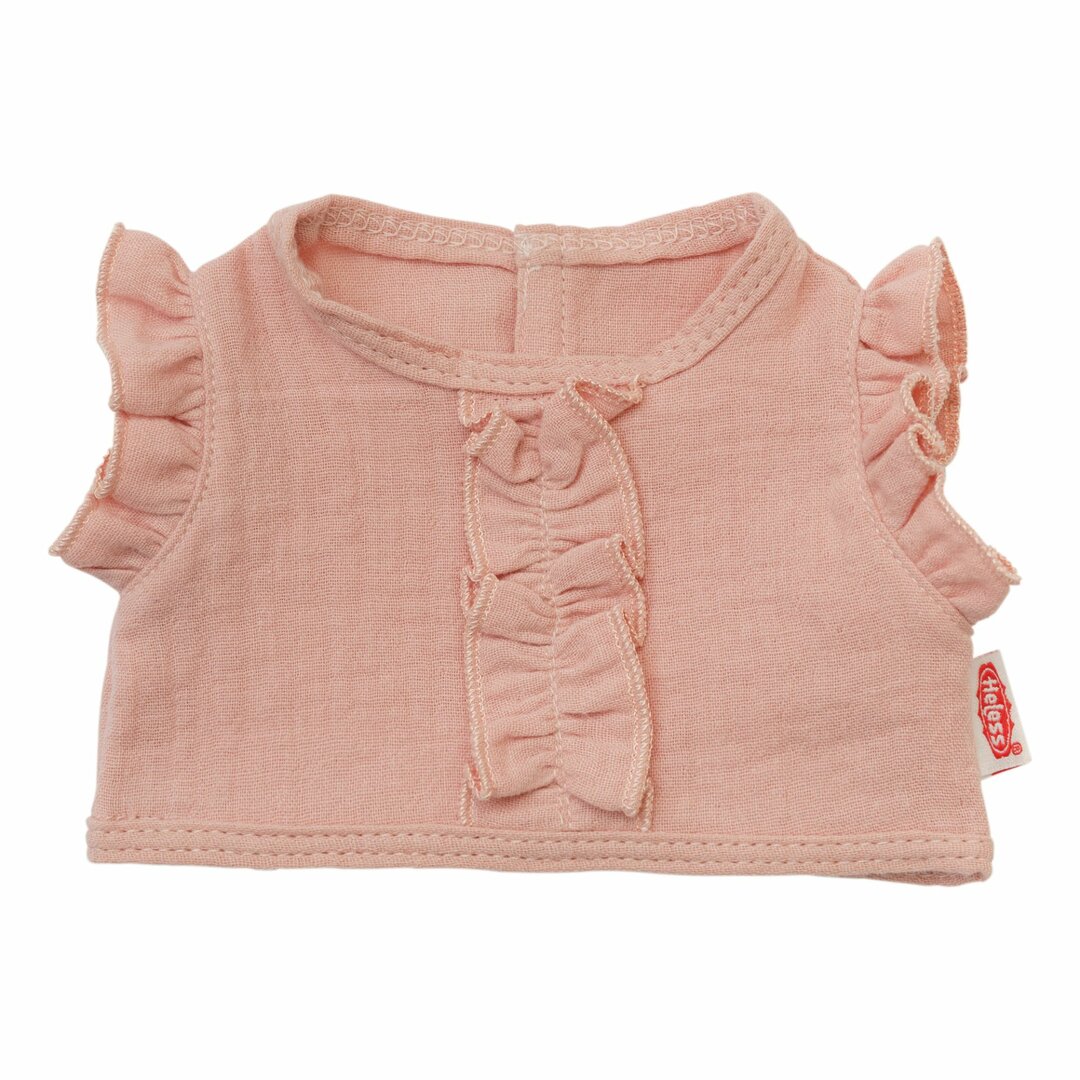 Een liefdevol ontworpen poppenoutfit die opvalt door de zachte kleur, hoge kwaliteit en charmante ruche-elementen.