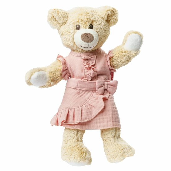 De zachte mousselinestof in zachtroze, afkomstig uit gecertificeerde biologische teelt, zorgt voor een bijzonder gezellige en natuurlijke speelervaring.