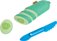 Er gaat niets boven een heerlijk stuk komkommer. En deze geheel stoffen halve komkommer is met het meegeleverde mes gemakkelijk in 4 stukken te verdelen. Uiteraard zijn de delen door het klittenband weer gemakkelijk aan elkaar te verbinden. Kinderen leren door het spelen met dit speelgoed meer over eerlijk delen en gezonde voeding.