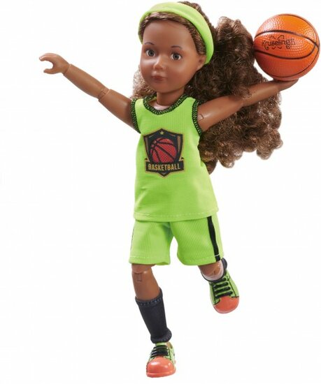 Deze kledingset Basketball Star van Käthe Kruse bestaat uit ​​een basketbalshirt een sportbroek, een haarband, onderbroek, beenwarmers en een basketbal. Hiermee heeft jouw Kruselingspop alles in huis om een heerlijk potje basketbal met de andere poppen of jou te spelen.
