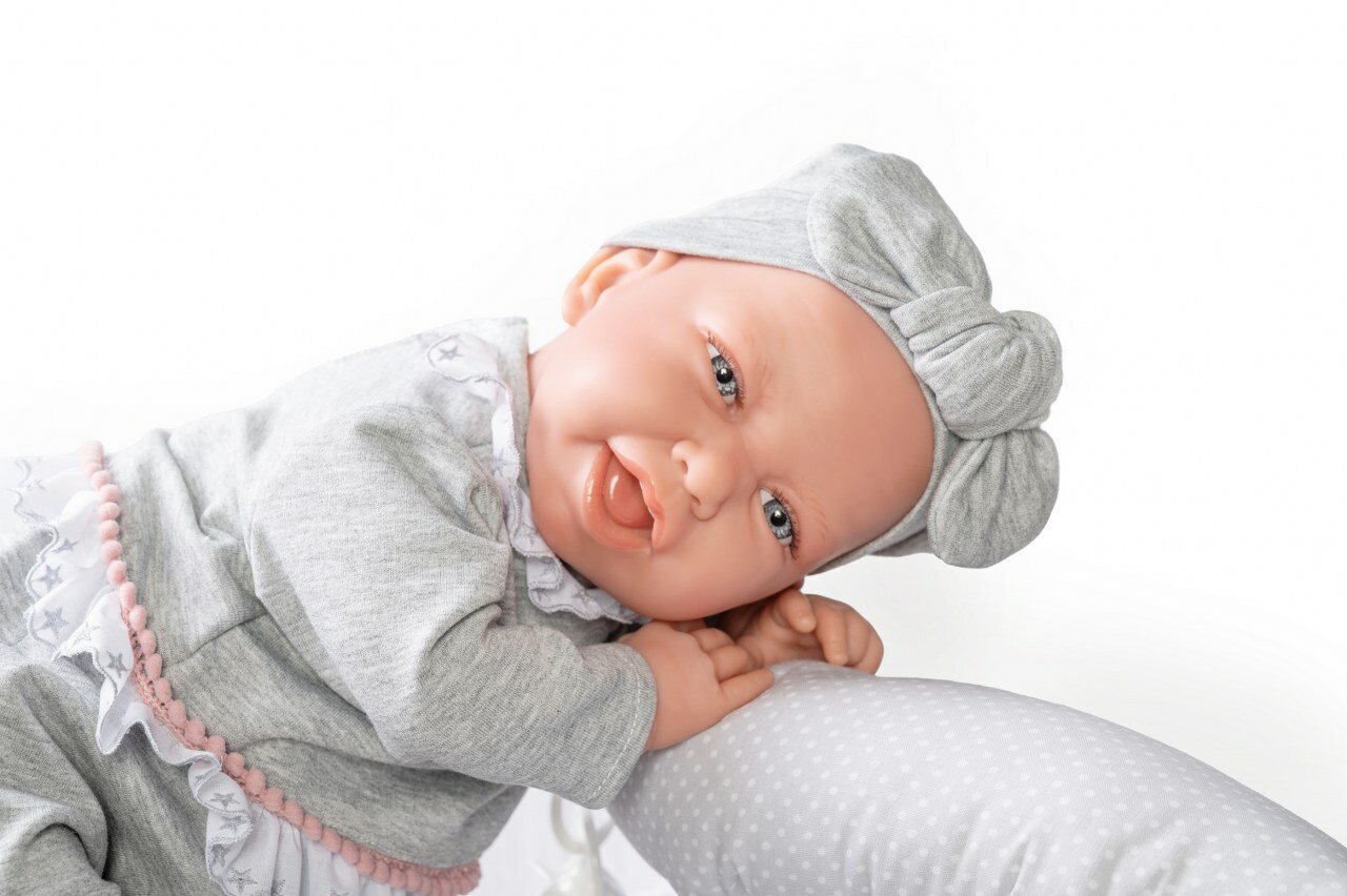 Haar lichaam is gemaakt van zachte stof om haar zachtjes te knuffelen en haar gezicht en ledematen zijn gemaakt van zacht vinyl. Ze meet 42 cm en weegt 800 gr. Ze kan in veel posities worden geplaatst als een echte baby omdat de ledematen draaien, het heeft beweging, wat het spelen met deze pop realistischer maakt. Is er iets schattiger dan een baby? Ze zal graag met je spelen!