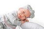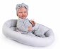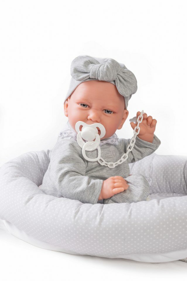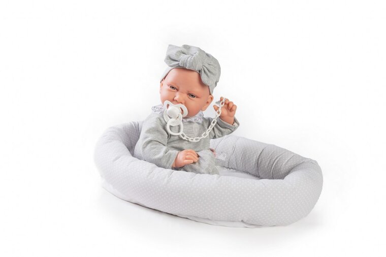 Pasgeborenen zijn de essentie van Muñecas Antonio Juan. Een universum van zoetheid gecreëerd om de kleintjes te vergezellen om de wereld te ontdekken. Deze vrolijke pop is gemaakt met een zacht lichaam die je uitnodigt om te knuffelen en de tederheid in jou wakker maakt. Jinte is een heerlijke babypop waar het geluk van af straalt. Jinte is 42 cm groot. Zij is gemaakt van de beste kwaliteit vinyl en voelt heerlijk zacht aan. De pop heeft een prachtige, levensechte, gezichtsuitdrukking en draagt een schattig mutsje, grijs broekje en shirtje en een fopspeen aan een ketting. De pop wordt met een nestje waartussen zij heerlijk kan slapen geleverd. Dit nestje kan ook in een poppenbedje gebruikt worden als beschermrand.