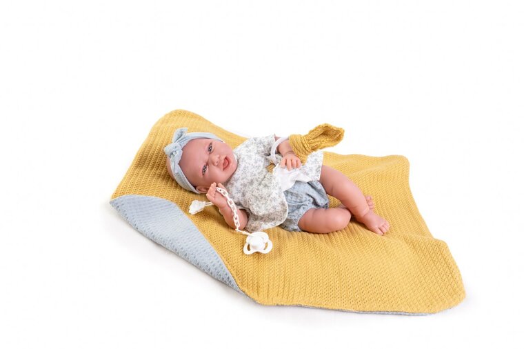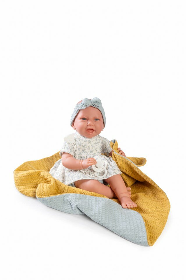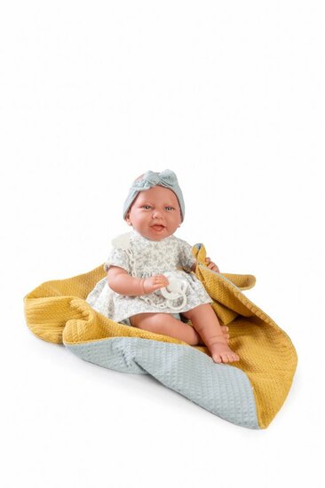 Pasgeborenen zijn de essentie van Muñecas Antonio Juan en deze Lachende Babypop Jorieke is echt een heerlijke pop. Deze vrolijke pop is gemaakt met een zacht lichaam die je uitnodigt om te knuffelen en de tederheid in jou wakker maakt. Jorieke is een heerlijke babypop waar het geluk van af straalt. Ze is 42 cm groot en gemaakt van de beste kwaliteit vinyl en voelt heerlijk zacht aan. De pop heeft een prachtige, levensechte, gezichtsuitdrukking en draagt een schattige haarband, jurkje met luierbroekje, bijtring en een fopspeen aan een ketting. De pop wordt met een heerlijke deken die aan beide zijden een aandere kleur heeft geleverd.