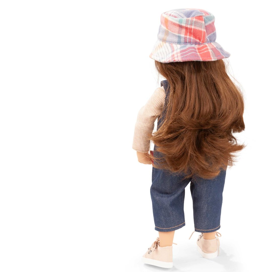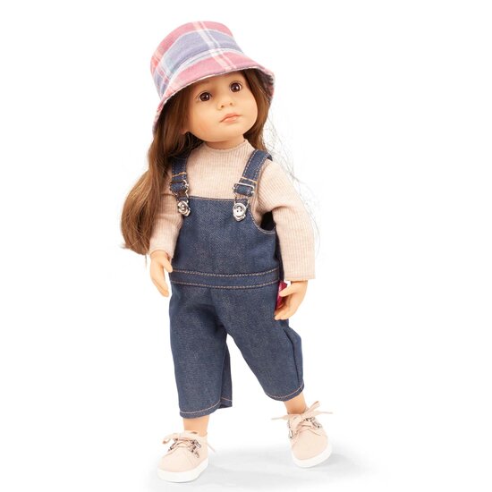 Grete houdt ervan om comfortabel en casual te zijn, dus draagt ​​ze haar jeanstuinbroek met gestreept overhemd met lange mouwen en canvas sneakers. Haar hoedje met ruitmotief is een must. Grete's bruine haar heeft dezelfde kleur als haar mooie ogen. Is ze niet gewoon schattig?!