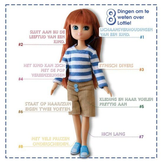 Lottie is 18 cm hoog en ontwikkeld met een aantal kernprincipes met betrekking tot het lichaamsbeeld en een positieve kijk op de kindertijd. Dit in tegenstelling tot andere poppen die meer ‘volwassen’ ogen. Lottie is vooral een kind van negen jaar met een lichaam van een kind.