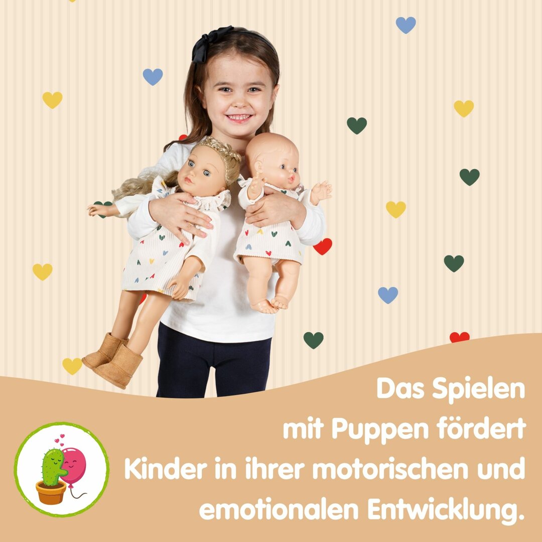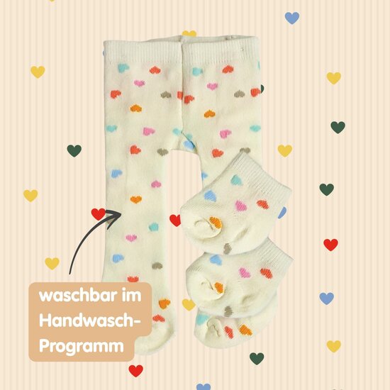 De maillot en sokjes confetti hart (35-45 cm) maken de outfit van je pop helemaal af. Talrijke kleine, kleurrijke hartjes geven de beige panty een vrolijke kleuraccent. De maillot en sokken passen perfect bij het corduroy poppenjurkje uit de "Heart Confetti"-serie, maar zijn ook te combineren met vele andere jurkjes uit de Heless-collectie.