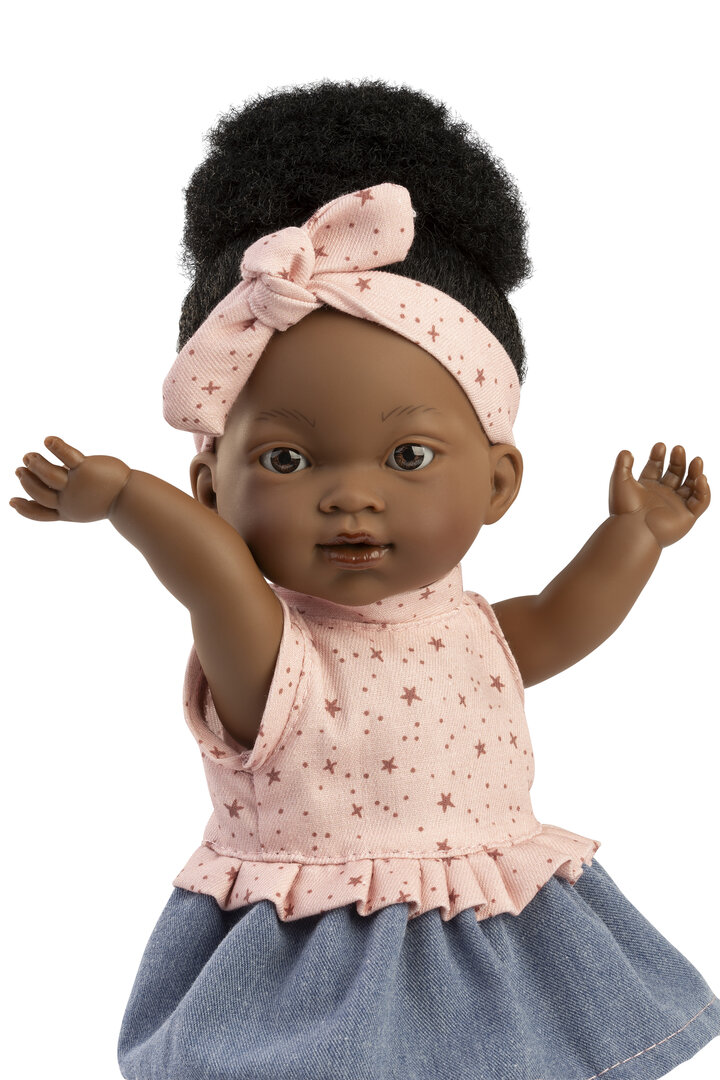 Pop Amara is een prachtige, bruin getinte pop met een warme uitstraling en een unieke stijl. Haar donkere kroeshaar is prachtig opgestoken met een roze haarband met sterretjes, die perfect past bij haar outfit.