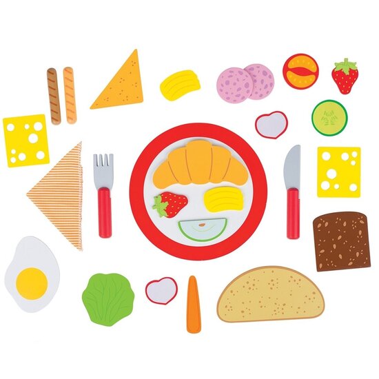 Maak een goede start in de ochtend met deze prachtige ontbijtset. De set bestaast onder meer uit een bord, mes en vork, boterham, croissant, gebakken ei, schijfje tomaat, diverse soorten beleg enz. Deze set omvat ook een menukaart waarmee u uw kind spelenderwijs alles kunt leren over een uitgebalanceerde en vooral gezonde broodmaaltijd. Niets houdt uw kind meer tegen om zijn/ haar eigen ontbijtrestaurant te beginnen.