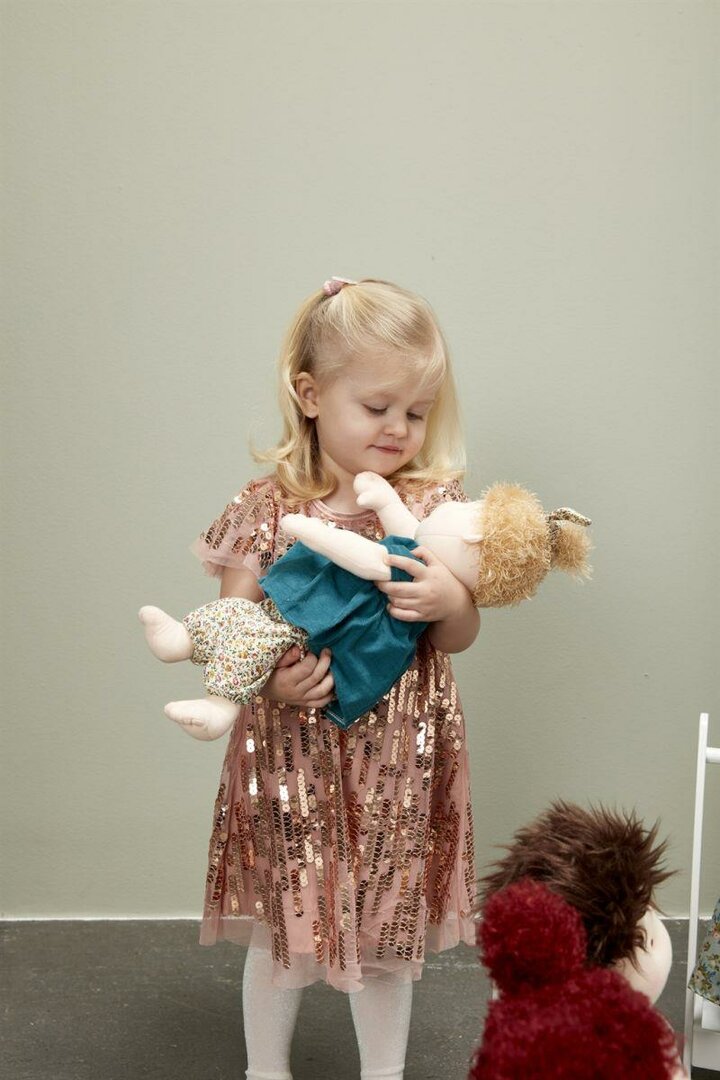 Zowel de pop als de poppenkleertjes kunnen apart in de machine gewassen worden op 30 ° C.