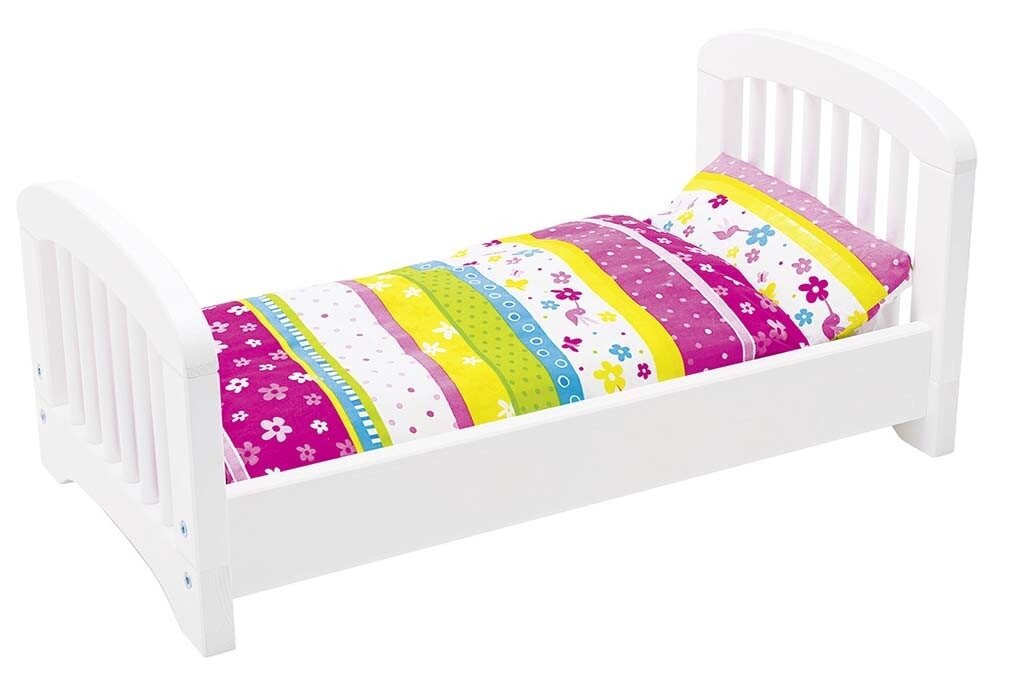 Het bedje is gemaakt van beukenhout en wordt geheel binnen de EU gefabriceerd. Dit houten poppenbedje is wit geschilderd en wordt zonder bijpassend beddengoed geleverd. Maak snel je keuze uit de verschillende soorten Goki poppen beddengoed en creëer het poppenbed van je dromen. Eén ding is zeker je pop zal slapen als een roosje. Welterusten pop. Slaap lekker!