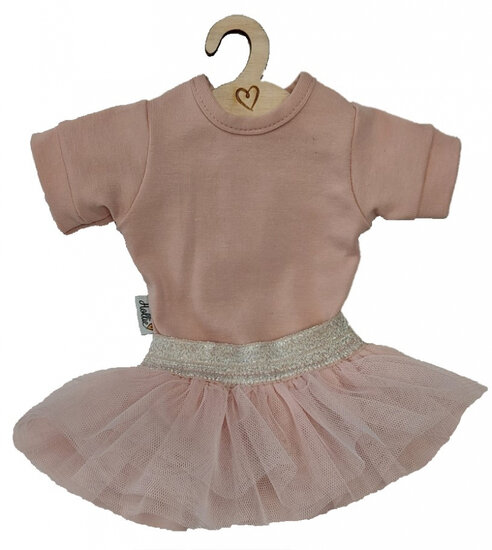 Een heerlijke gympakje met daaroverheen een rok van tule. Geschikt voor alledag maar ook zeer geschikt als feestjurkje. Deze poppenkledingset van Hollie is heel geschikt voor de Gordi popjes van Paola Reina maar leent zich uiteraard ook voor andere speelpoppen en beren met een lengte tot 34 cm groot. De poppenkleren van Hollie worden compleet met een leuke houten kleerhanger speciaal voor poppenkleren geleverd.