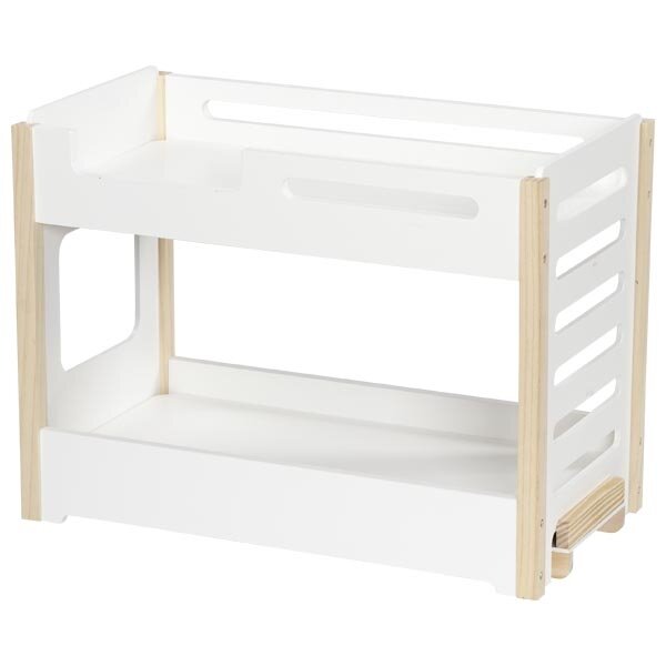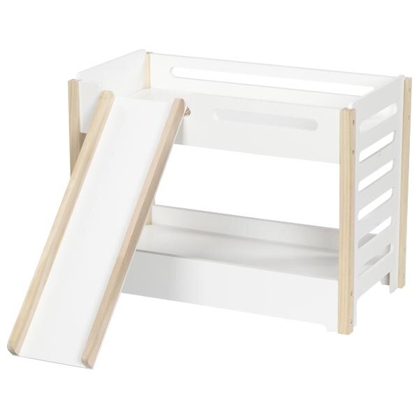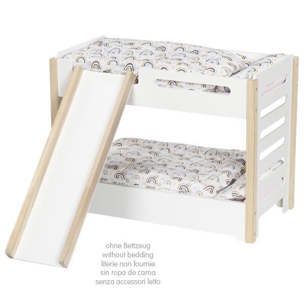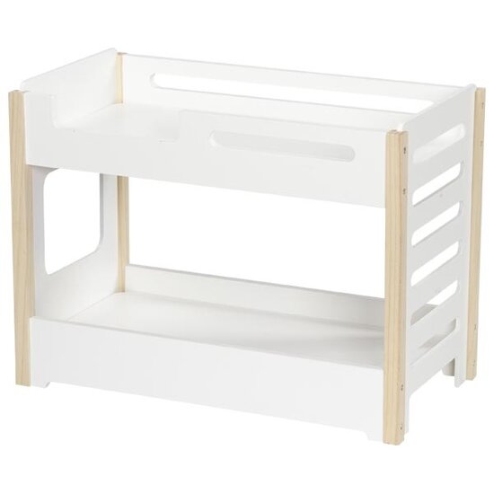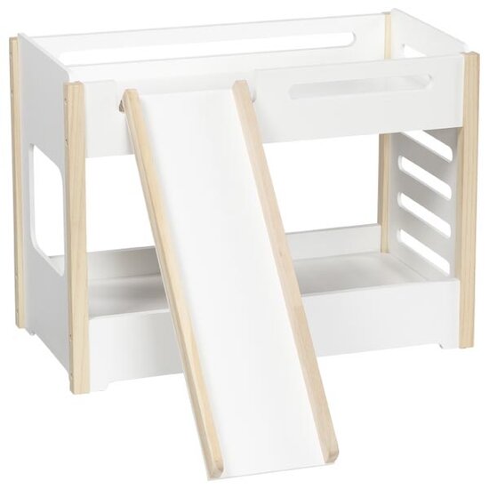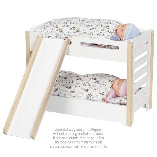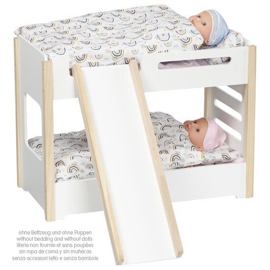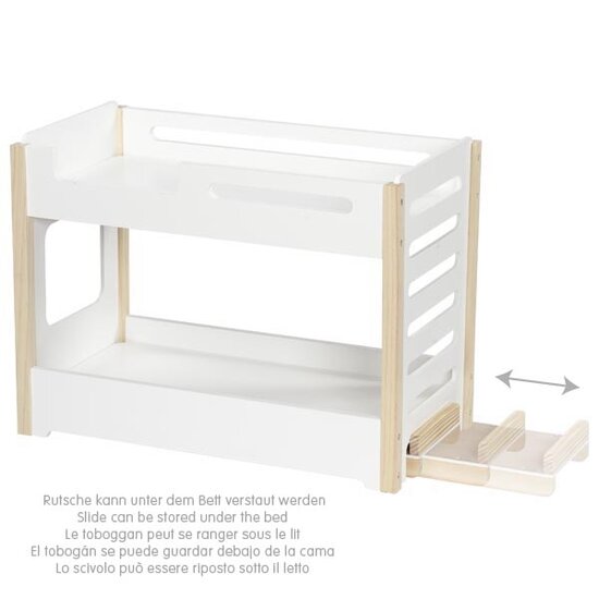 Het is voor elke poppenouder belangrijk dat hun favoriete pop lekker warm in bed ligt, maar wat doe je nou als je 2 kindjes hebt? Precies die leg je te rusten in dit prachtige stapelpoppenbed, gemaakt van massief hout kun je jouw 2 favoriete poppen of knuffels heerlijk laten slapen. De glijbaan, ladder en lade geven het zeer functionele poppenbed een aantrekkelijk, speels karakter. Wil je de glijbaan weglaten omdat de poppenkinderen anders de hele nacht blijven spelen? Dan is er ruimte onder het bedje om de glijbaan tijdelijk op te bergen.