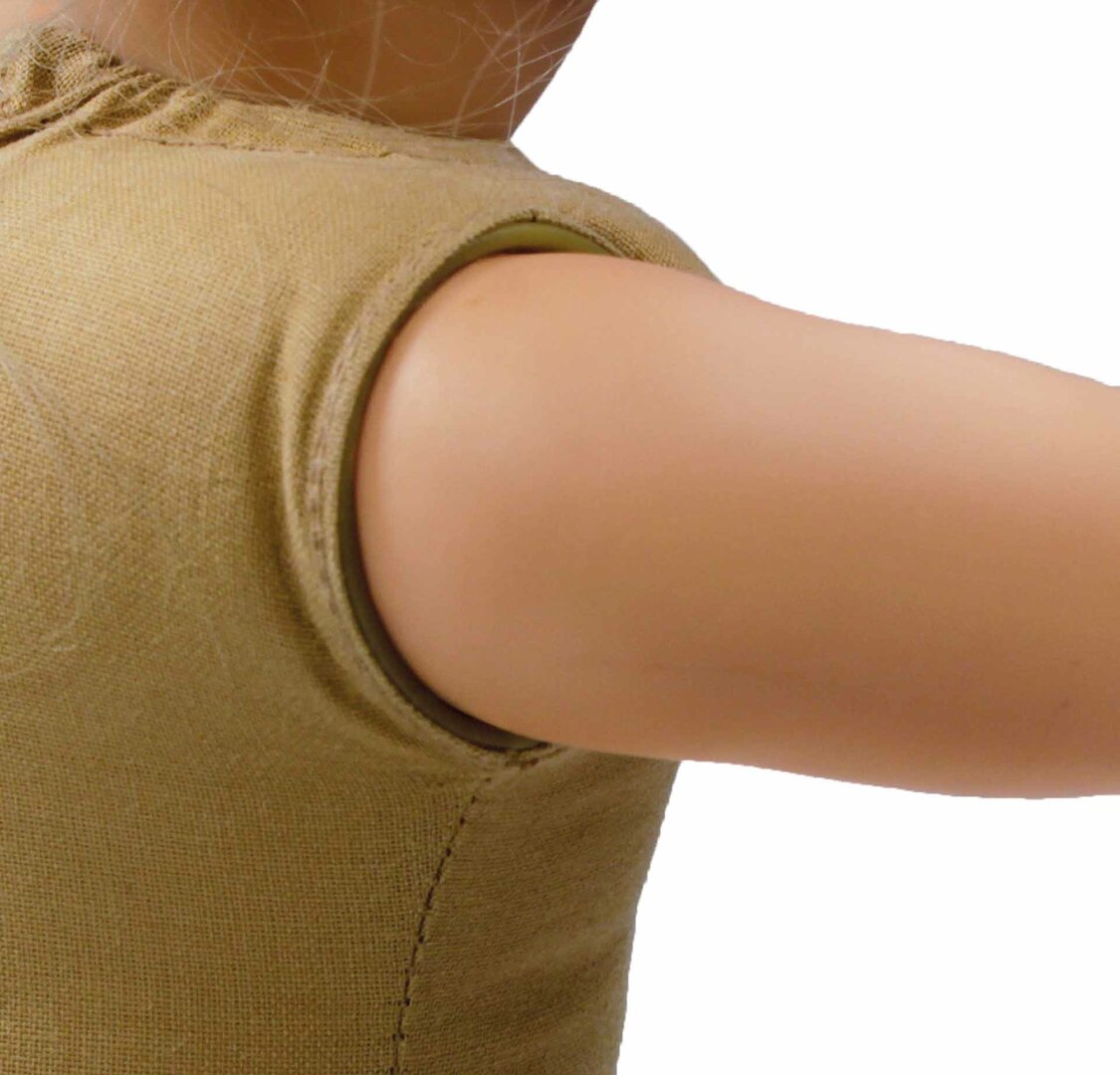 Haar vinyl armen en benen voelen prettig aan en zijn eenvoudig schoon te maken. Bovendien is haar haar stevig in het hoofd genaaid, waardoor het extra sterk en goed te onderhouden is – ideaal voor dagelijks gebruik.