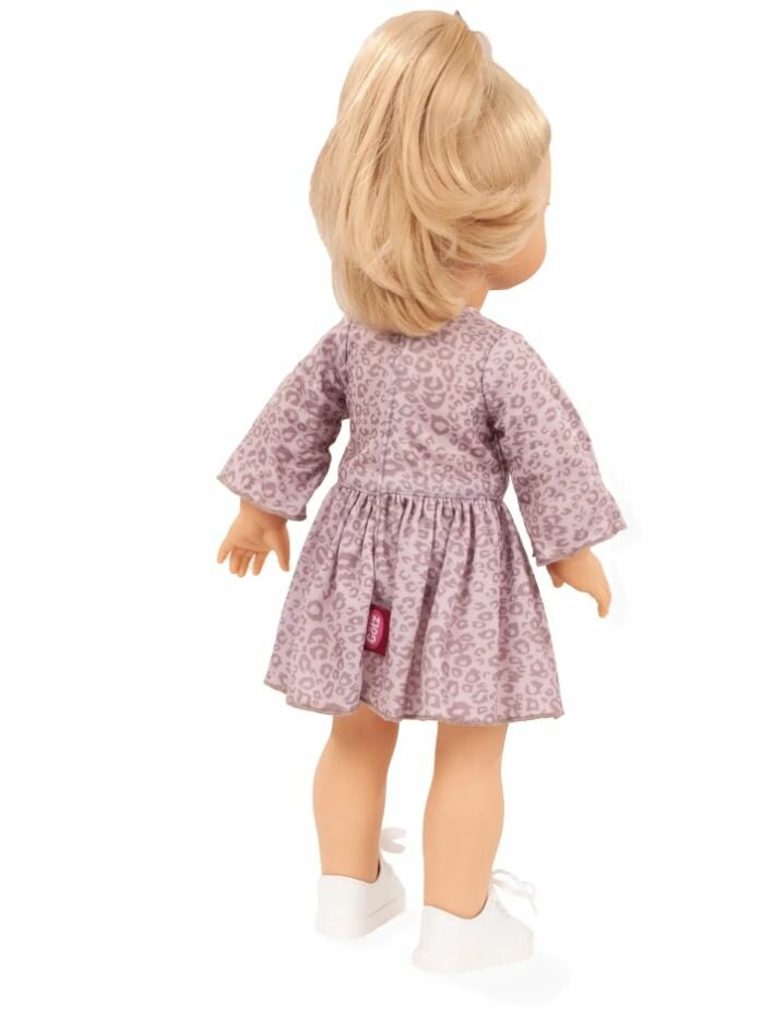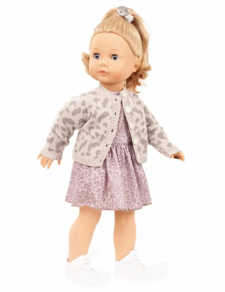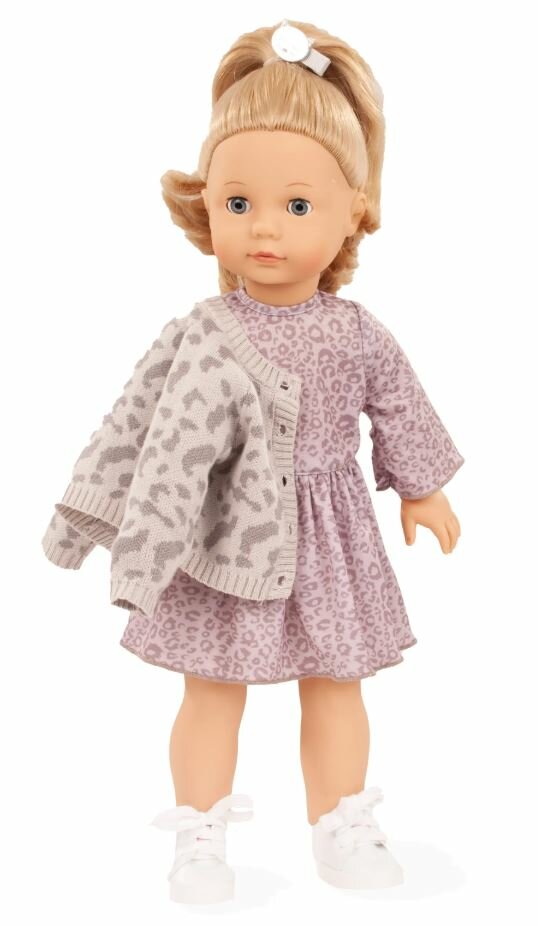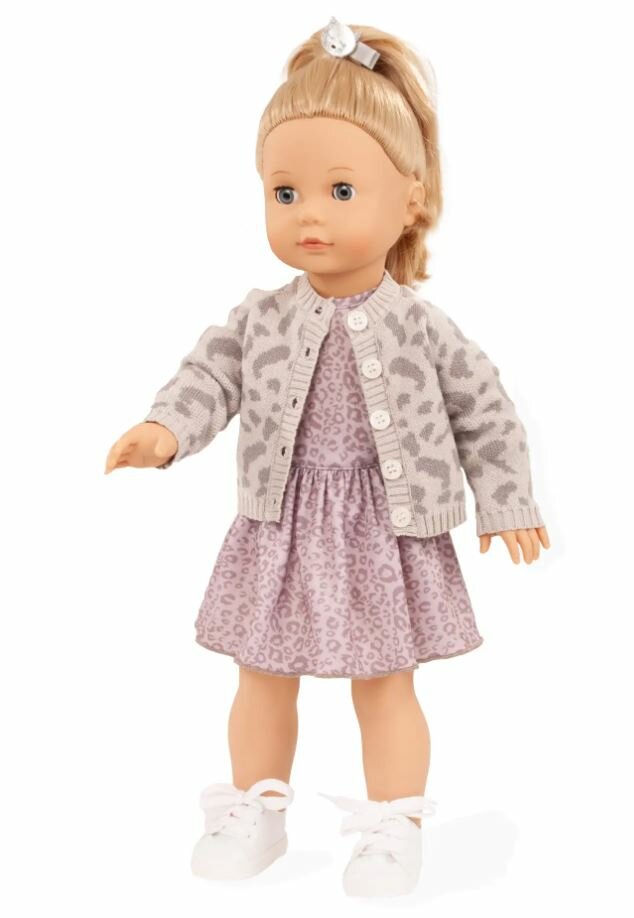 De Jessica Grey Cat speelpop van Götz straalt met haar elegante zomerjurk in lila-grijs luipaardmotief. De speelse trompetmouwen en de zwierige rok geven haar een frisse en moderne uitstraling. Haar look wordt compleet gemaakt met een trendy gebreid vestje in bijpassend luipaarddesign en witte sneakers.