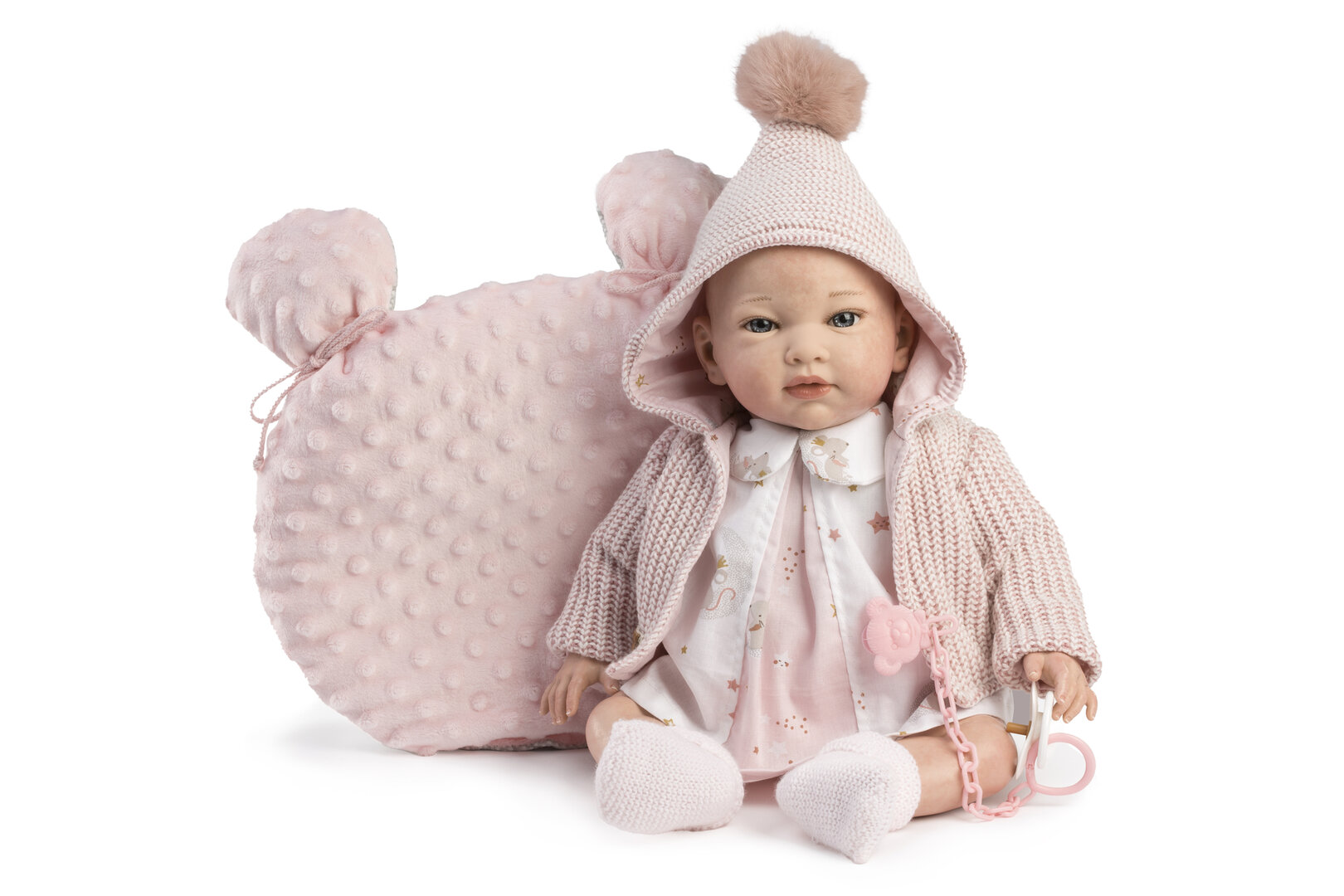 Ze draagt ​​een schattige kledingsetje met daaroverheen een heerlijk warm vest met op de muts een schattige pompom. Aan haar vest draagt zij haar favoriete speen aan een speenketting. Maria heeft ook een heerlijk kussen meegenomen waar zij lekker op kan liggen als je haar de fles geeft.