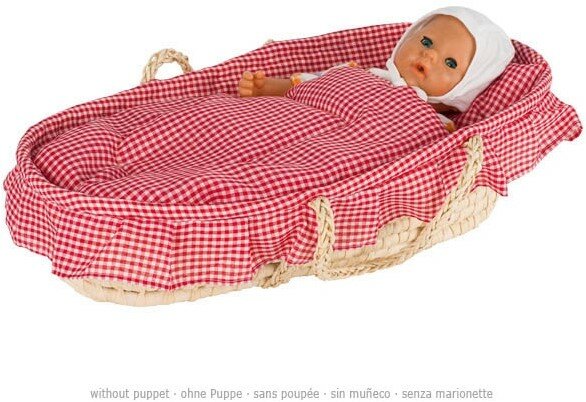 Neem je pop mee op stap met deze schatige rieten reiswieg met bekleding en beddengoed. Deze reiswieg is geschikt voor allle speelpoppen met een lengte van maximaal 52 cm lang. De afgebeelde pop is niet inbegrepen.
