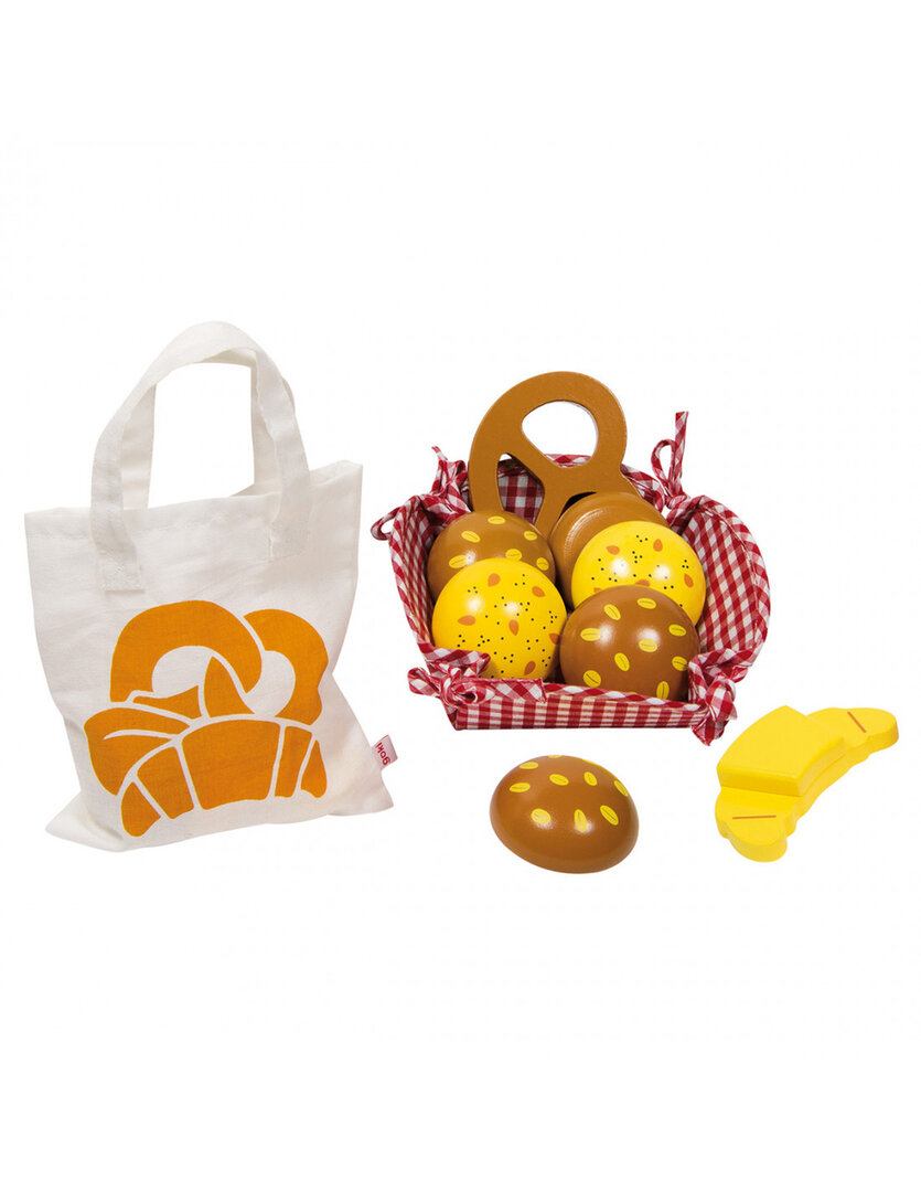 Set van bakkerijproducten in ontbijtmandje, inclusief boodschappentas gemaakt van katoen. Leuk voor in je eigen winkeltje of voor op de ontbijttafel.