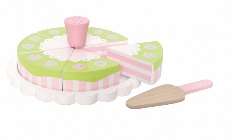 Een klassieke prinsessentaart voor kinderen die graag koffie drinken en restaurantje spelen! Met voorgesneden taartstukken is het zowel gemakkelijk als leuk om de punten te verdelen. Bevat 6 voorgesneden taartstukken met een roze roos om in het midden te plaatsen. Ook inbegrepen is een witte serveerschaal en een bijbehorende taartschep.