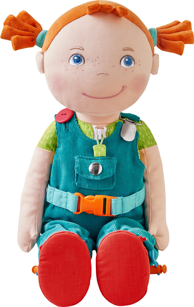 Hoi, ik ben Lucie en ik ga jou helpen met het leren van allerlei vaardigheden zodat jij straks helemaal alleen jezelf aan kunt kleden. Deze prachtige pop, met een natuurlijke levensechte uitstraling, helpt kinderen niet alleen bij het leren aankleden; deze pop zal ook een heerlijke pop om mee te spelen zijn. Lucie heeft 8 verschillende methodes om iets mee vast te zetten zoals een drukknoop, rits, klitteband enz. Het lijfje is gemaakt van zachte materialen om heerlijk mee te knuffelen. Het T-shirt en de schoenen zijn vastgenaaid aan de pop. De overall kan wel helemaal van de pop afgehaald worden.